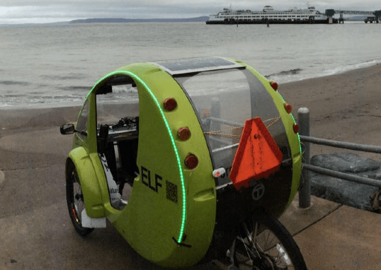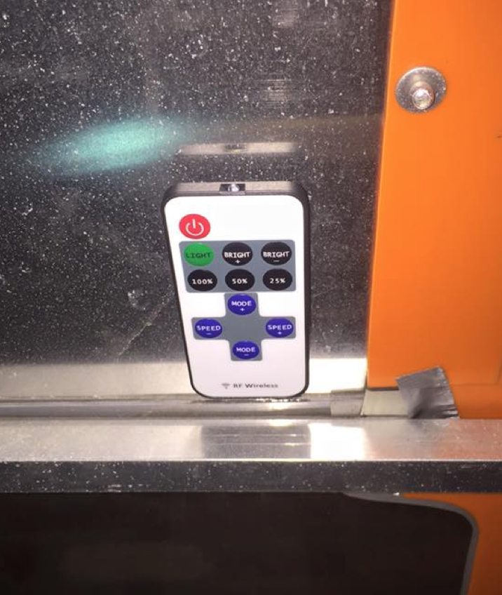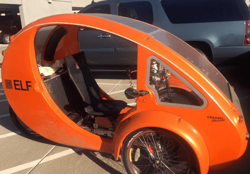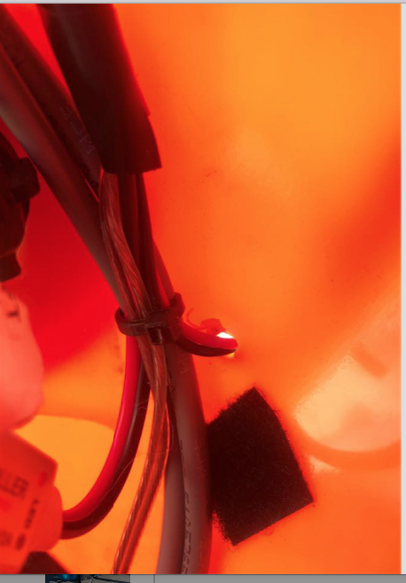 LED Controller - $3 on Amazon and some LEDs that come in many colors (about $10). Wiring is just a matter of connecting red wire to red and black to black. With no controller, just install LED on outside, drill a small hole to pass the wire through and connect. The LED controller is an option that requires a wire run from one side to the other. Two LED controllers means no connecting wire needed. Mark ran the LED strip from the front turn signal to the tail light with a small hole drilled to pass the wires through to the inside. [note: you can also loosen the tail lights and feed the wire through the hole to avoid drilling] The LEDs have a peel-and stick backing that works well for a while but probably should be reinforced with a better adhesive. You can run the str ip wherever you like. My installation uses about 9' of the 16' on each LED wire roll, so you may wish to buy 2 rolls. You can make it shorter and use 8' for each but will need to solder connector wires to the second half of the LED strip. You can also wire up leftover pieces to put patterns on the ELF on the front, sides, or back if you wish. My configuration does not interfere with night vision as the lights are barely visible through t he body and are not directly visible to rider. Controller remote is attached with 3M Heavy Duty Fastener (like a super-duty velcro) to the bottom of the solar panel just above the windshield. You can mount it anywhere you want. I didn't want it too obvious to curious hands. Inside of hole to pass wire through from outside. Note that the light to the LED wires goes up to that black electrical tape. In the 1 controller configuration, you see the LED wires (red & black coming through hole), controller's output wires (red & black from left of picture), and my wire that connects this to the right side (silver and gold speaker wire) are joined together in a pair of butt-end splices. Because of the vibration in an ELF, I strongly recommend soldering the wires together, then covering with electrical tape. I would not trust crimp connectors in this application. The full set of wires is then cable tied to the existing wires to eliminate mechanical pull against the splice. Note that I used a soldered butt-end splice to tap into the labeled left tail light wire. This is also a pair of 3-wire splices: incoming to light, outgoing to light, incoming to LED controller (white structure under fingers at right). LED controller wired in with connector wire run to the other side. Note both sets of butt-end solder splices are cable-tied in place. ----------------------------