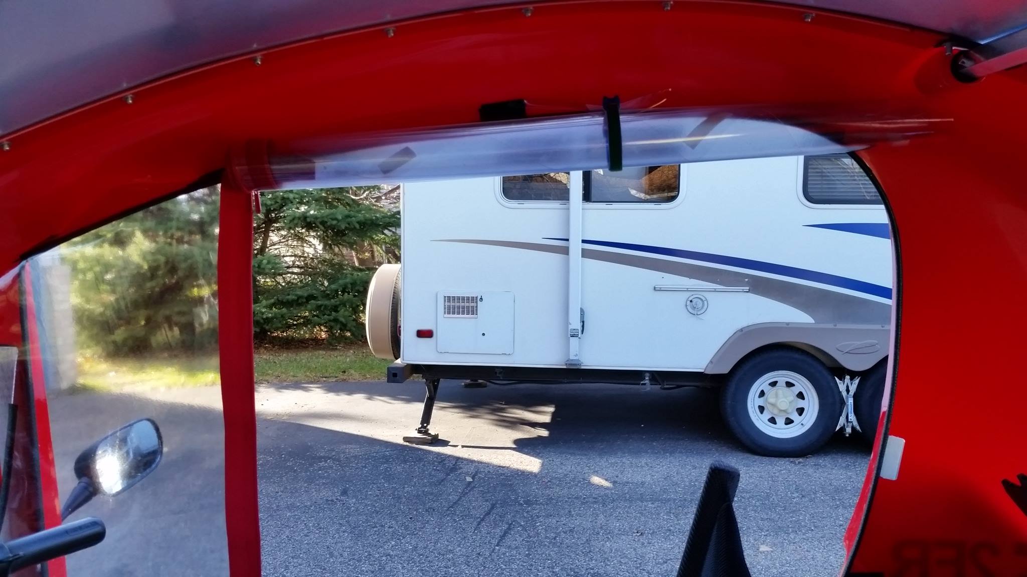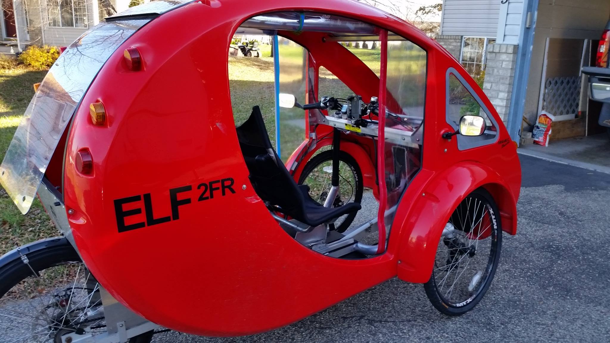 ELF Owner Greg Parkhurst has created Side Shields. The Side Shields are made from heavy duty clear flexible vinyl (0.015” thick) and they attach to your ELF with 3M Hook & Loop. The Side Shields have a zipper that can be accessed from inside and outside for easy entry and exit. You can install them in about 8 minutes per side. They can be removed when not needed or they can be rolled up to put them out of the way. The back seat, top deck of the trunk and inside rear window stay clean and dry. These block out almost all of the wind (still get a little from the feet area but that is another project!). No more cold drafts on the back of my neck. The Wind and Rain Side Shields are currently available from Tonka Tronix Price: $99.95 + shipping for the pair. If you would like to order a pair check out the Tonka Products website. |