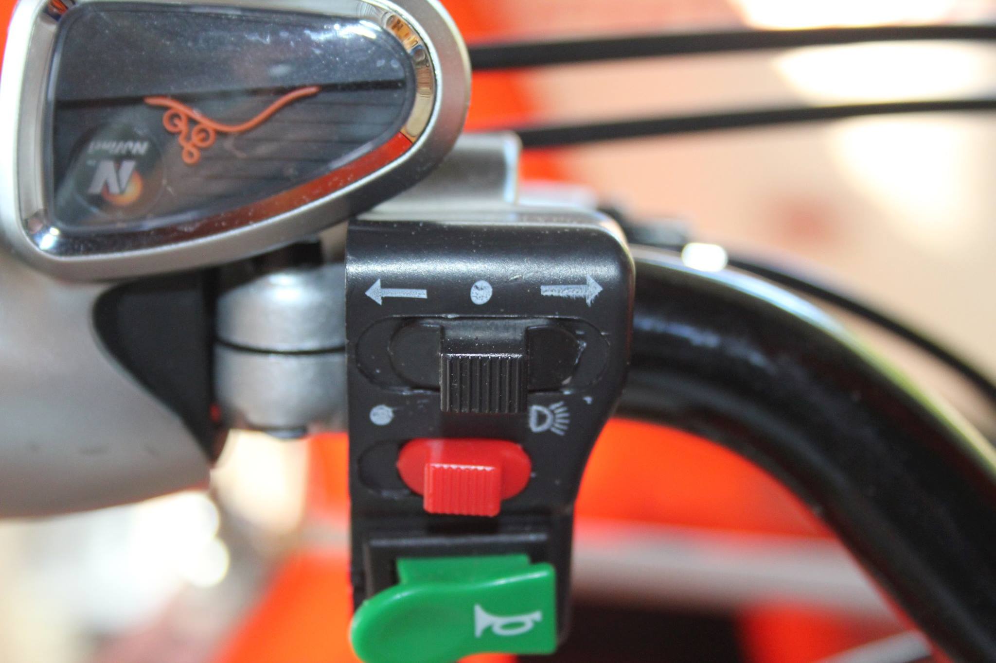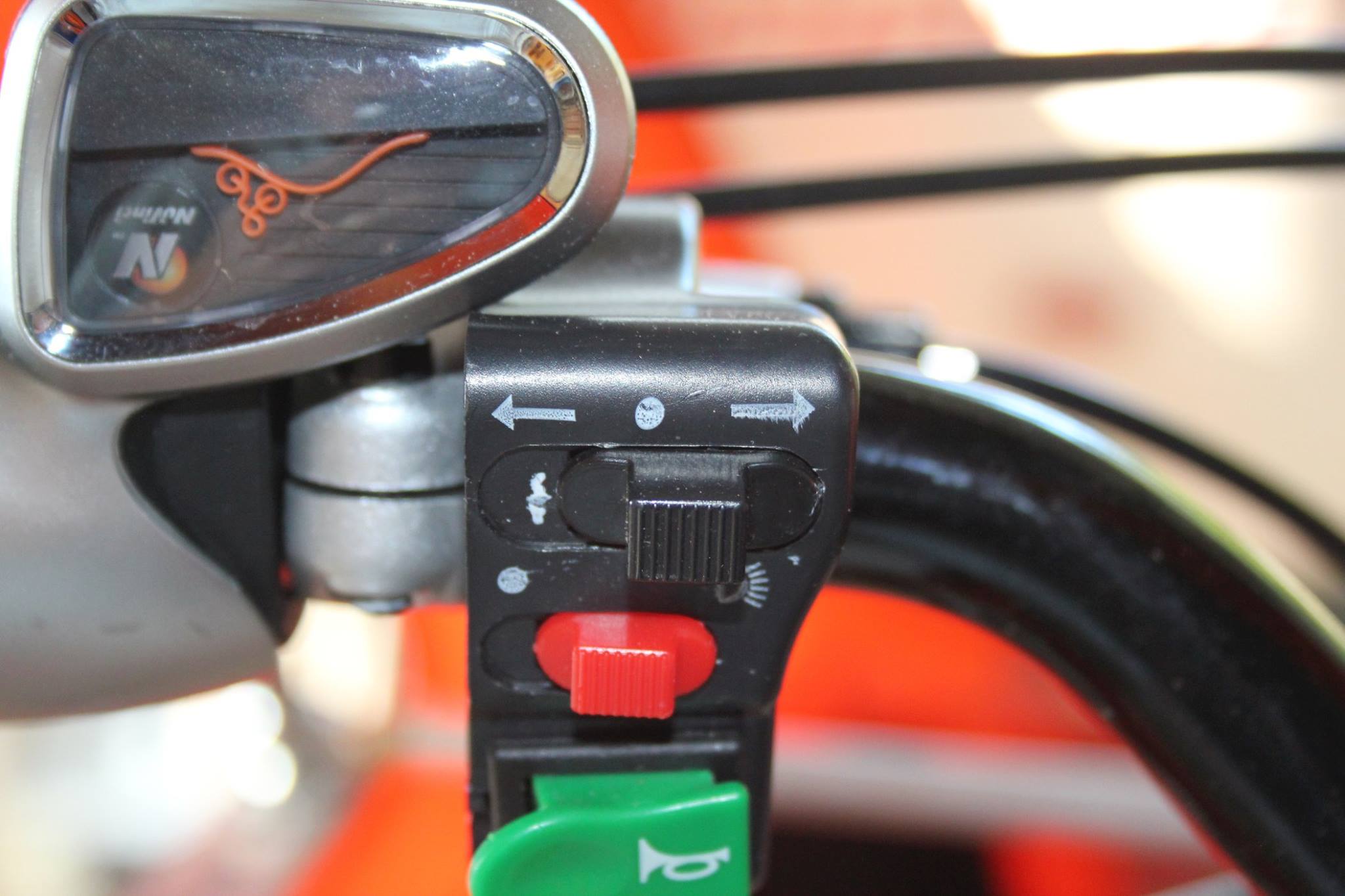 Newer ELFs have turn signal indicators on the side view mirrors and/or the rear view mirror. For those of us that have an older ELF here is a quick hack to help remind you when you signal is on. A bit of white finger nail polish provides an easy upgrade. 1) Move turn signal switch to right 2) Make a thin white line immediately to the left of the switch 3) Allow to dry 4) Move turn signal switch to left 5) Make a thin white line immediately to the right of the switch 6) Allow to dry In under five minutes you have something you can see while riding that shows the position of your switch as seen in the photos below (left turn, off, and right turn). |